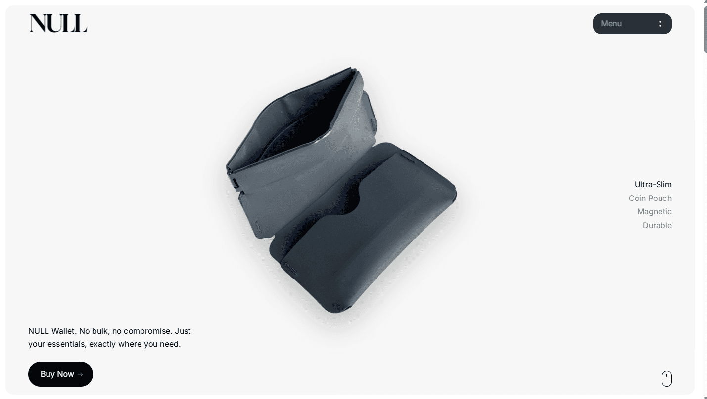 NULL is a minimalist wallet brand I started under Vinsidian Labs. The idea was simple, I wanted a wallet that was as slim as possible without sacrificing function. The result was a wallet made from TPU with a squeeze-to-open coin pouch and magnetic closures. It's my first real product launch from design to manufacturing to branding to fulfillment, and I learned a ton getting it off the ground.